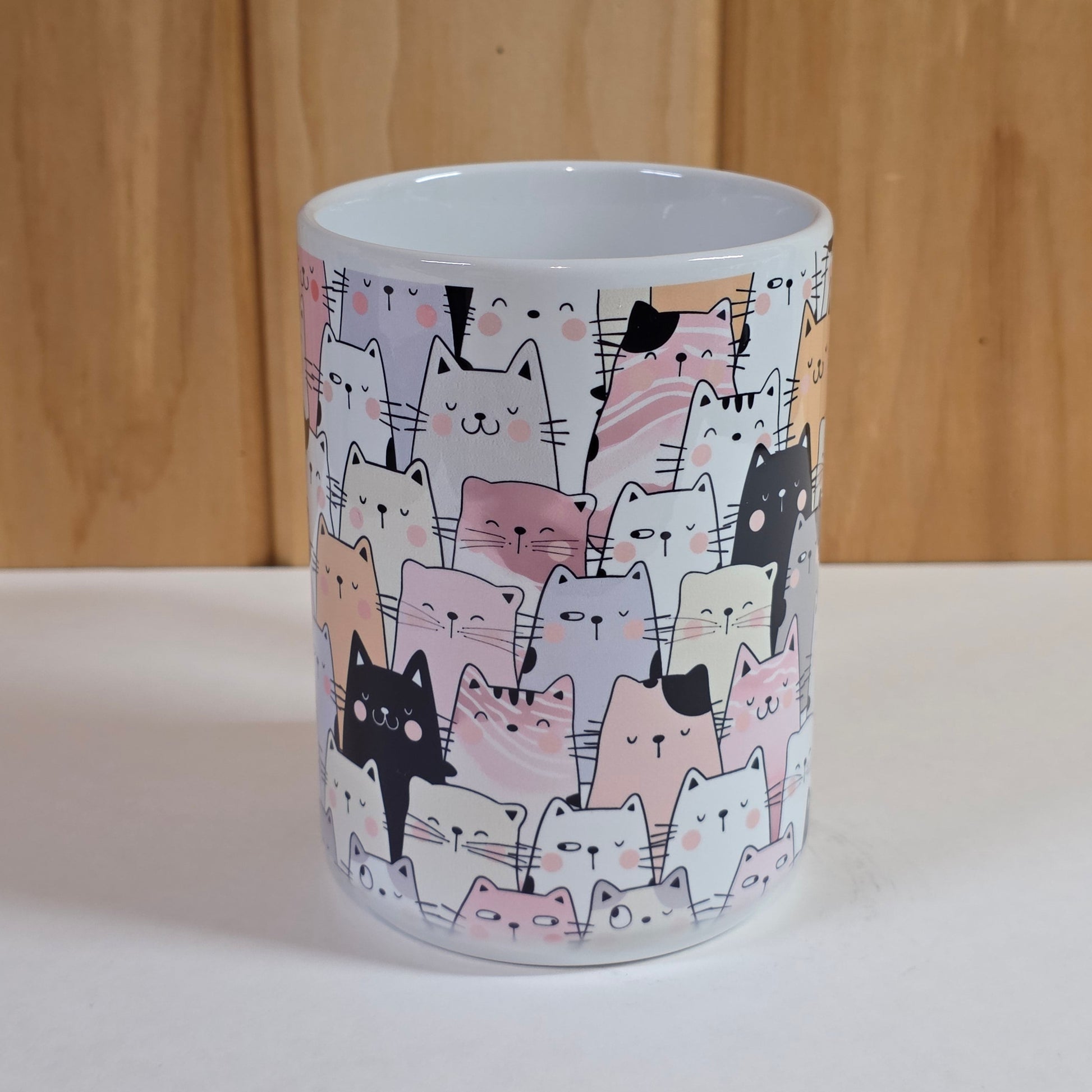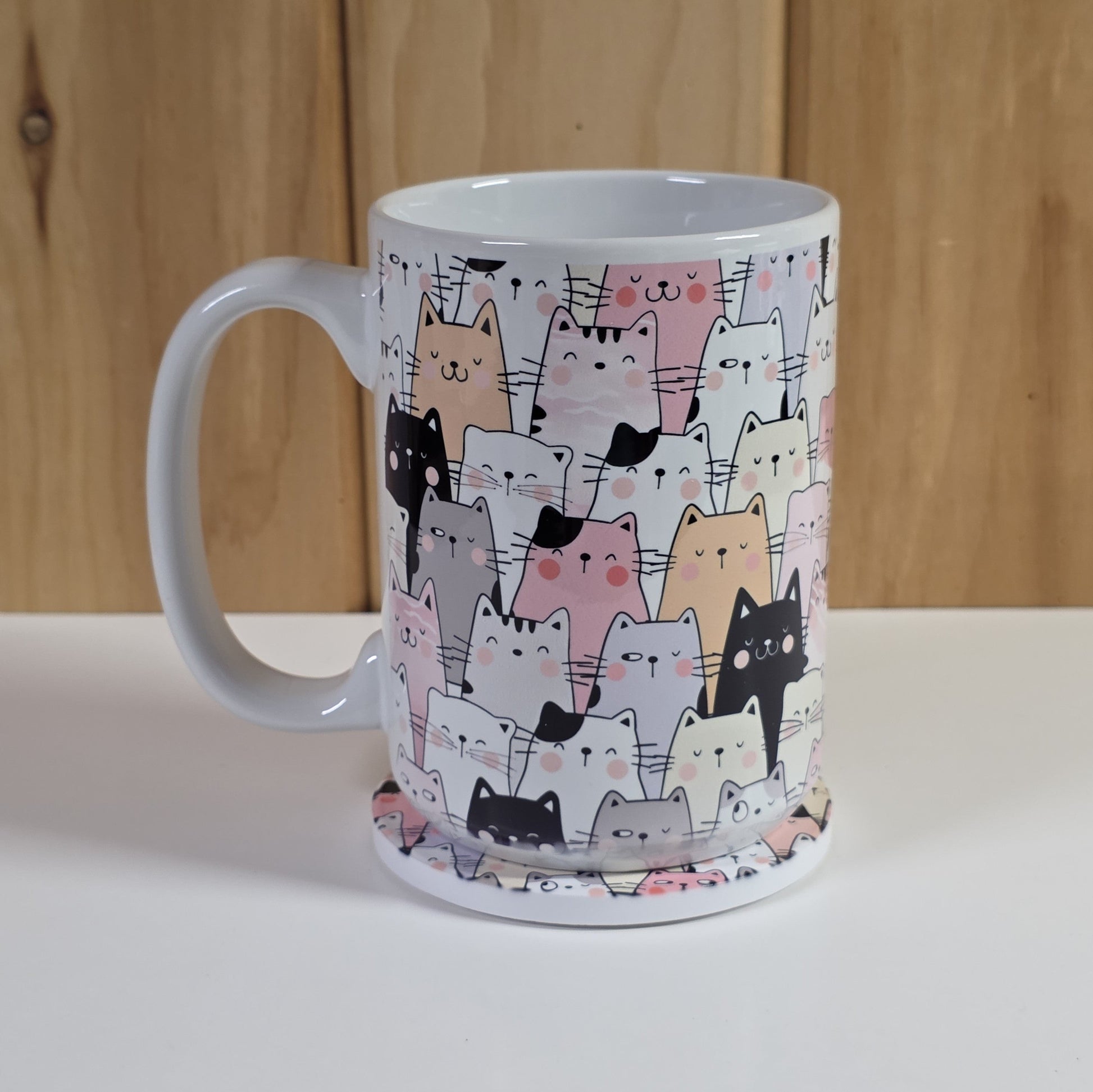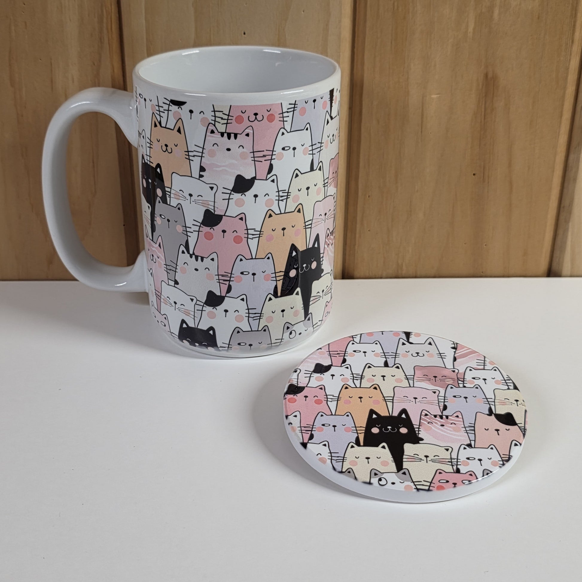 This cute cat set includes a 15 oz ceramic mug and matching coaster featuring rows of pastel and black-and-white kitties with sweet little faces.