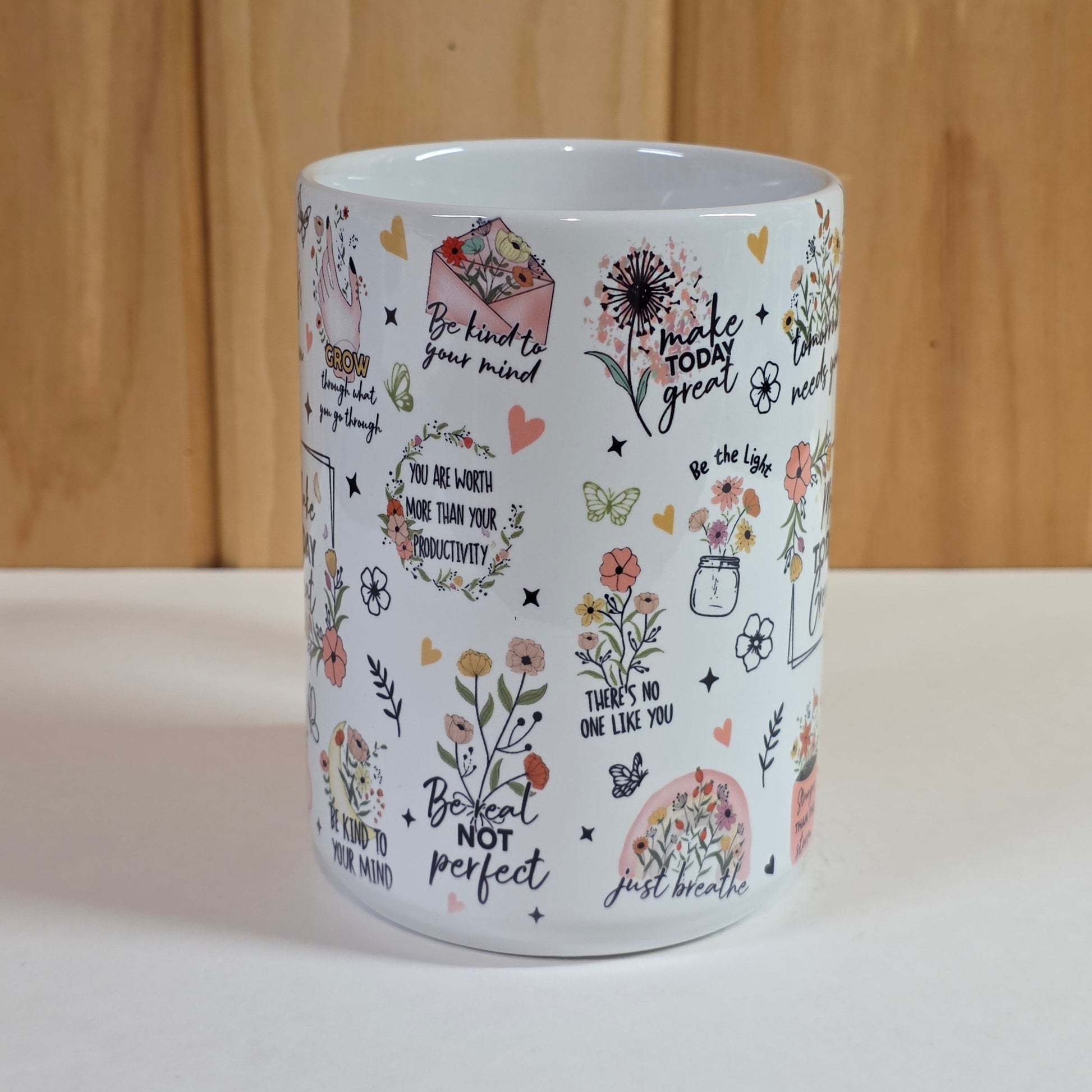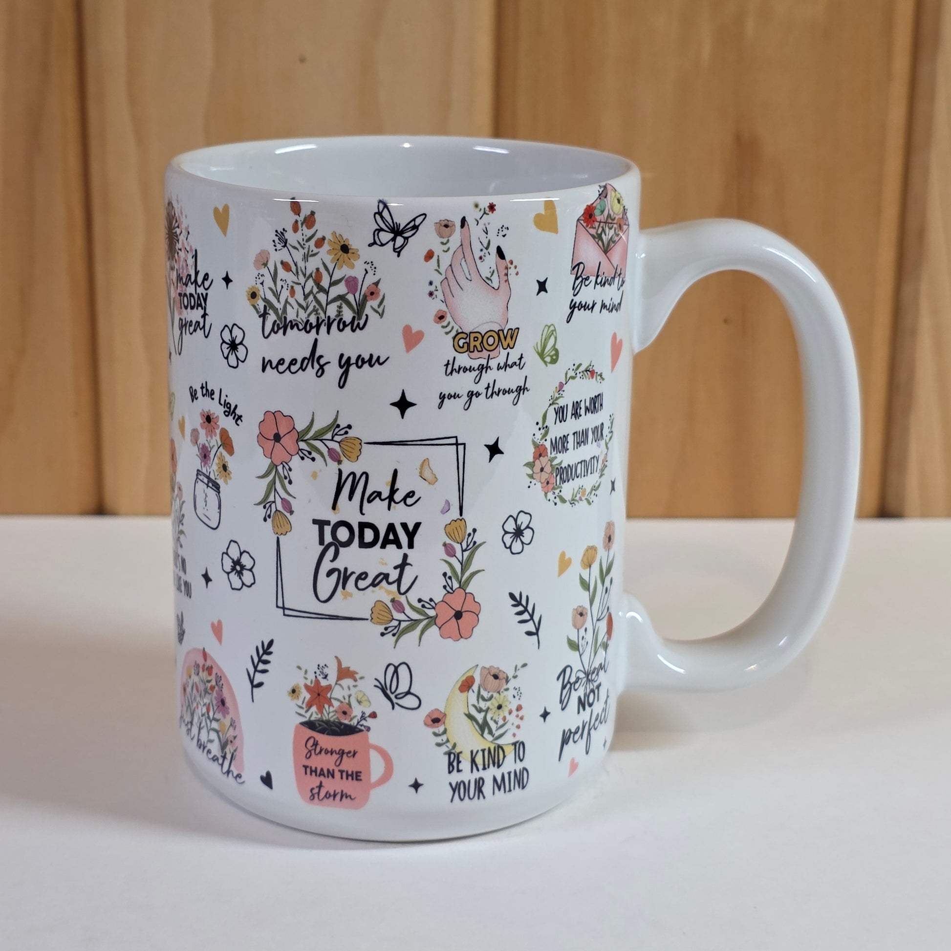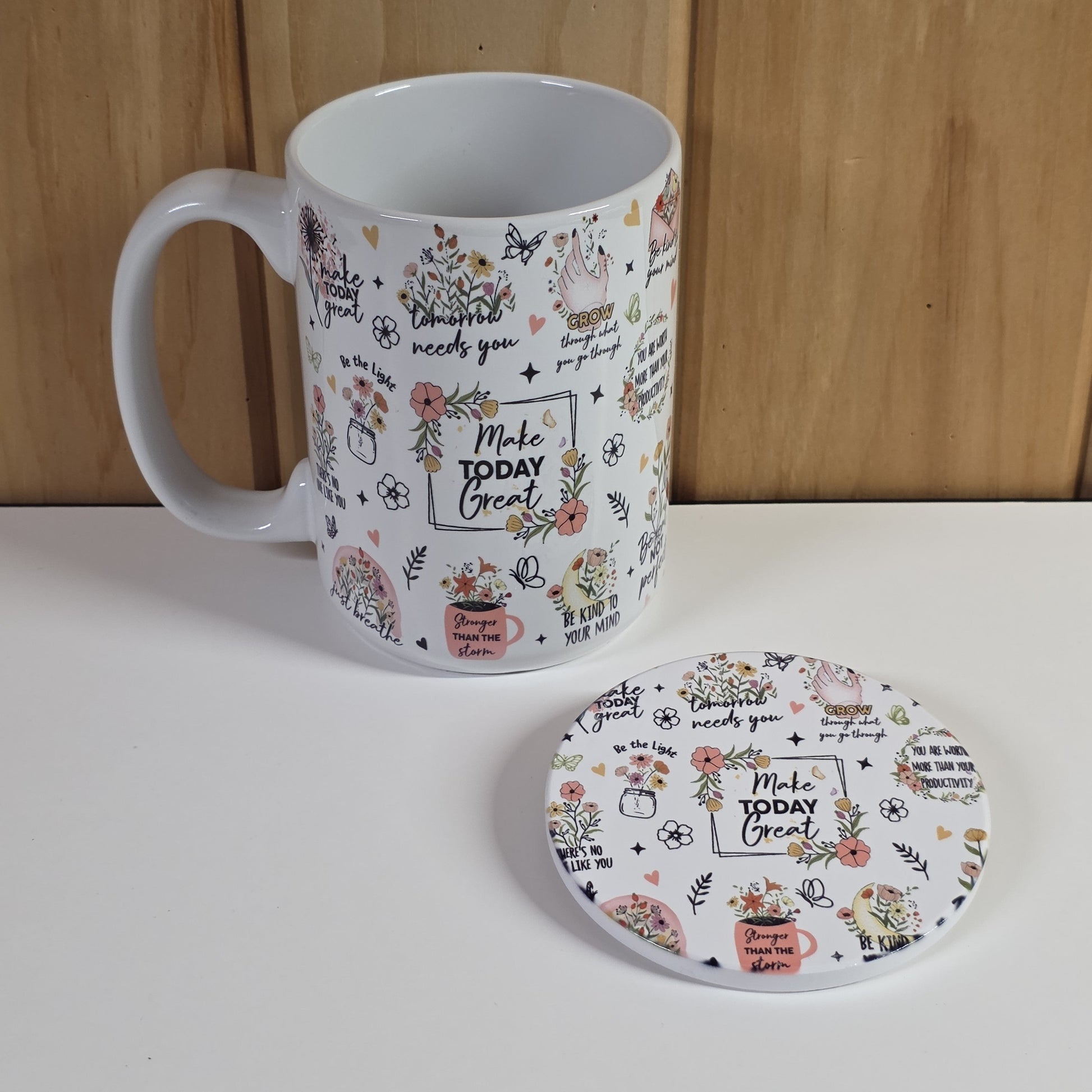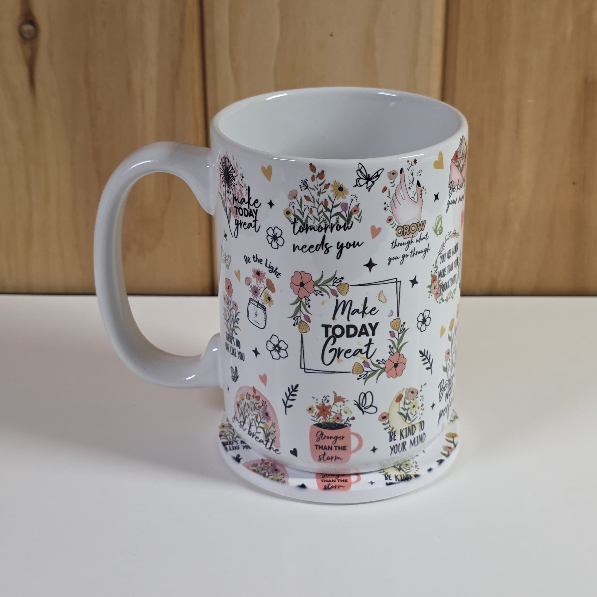 This 15 oz ceramic mug and matching coaster wraps you in daily affirmations — from “Make Today Great” to “Be Kind to Your Mind” — all surrounded by soft florals, uplifting icons, and gentle reminders to nurture your spirit.