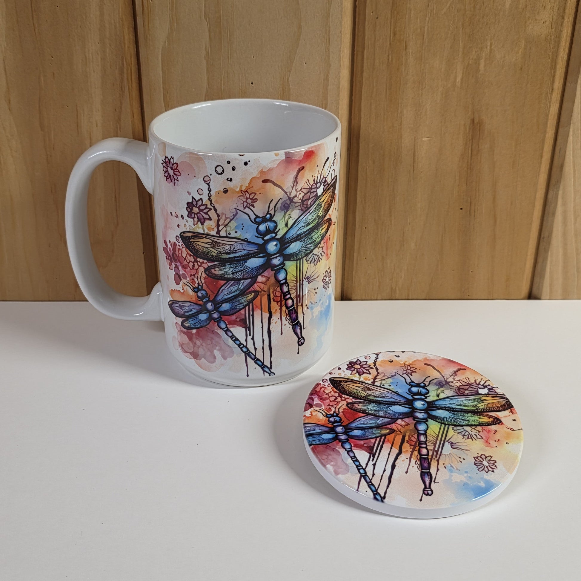 This striking set includes a 15 oz. ceramic mug and matching coaster featuring a stunning watercolor dragonfly design. With vivid hues and intricate linework, it captures the beauty of transformation, light, and motion — a true tribute to nature’s artistry.