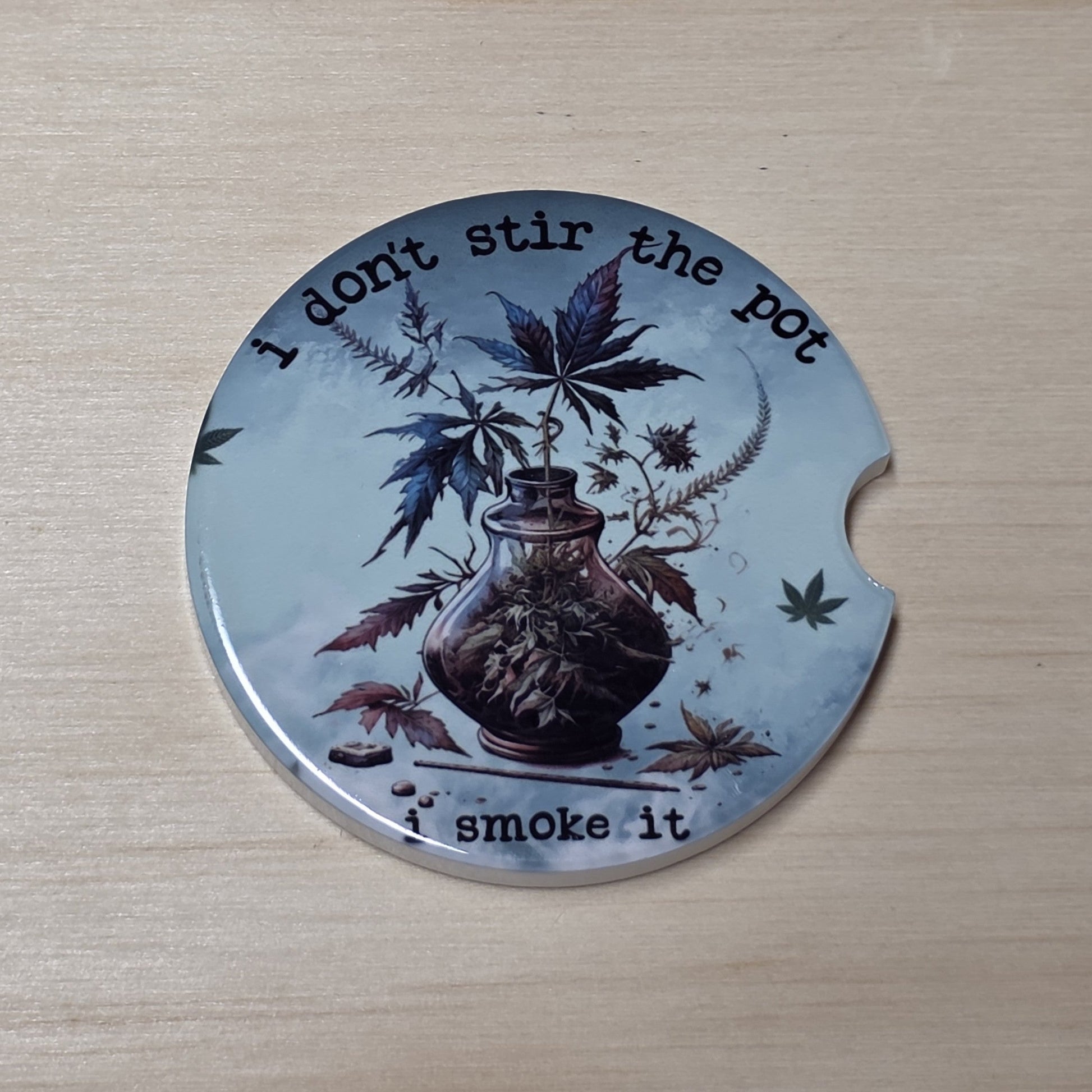 This cheeky car coaster set includes two ceramic coasters with a bold design that reads “I don’t stir the pot, I smoke it” alongside leafy greenery and a rustic jar. A fun, lighthearted way to keep your cup holders clean while showing off a little personality.